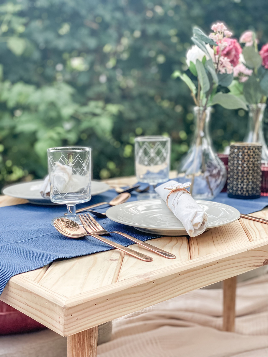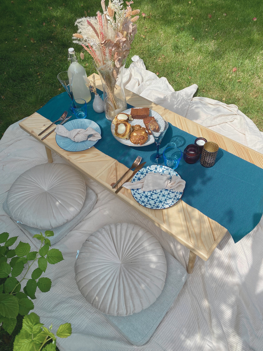 Grondzeil, picknicktafel, glazen, borden, bestek, picknicklaken, kussens, decoratie, tafellinnen